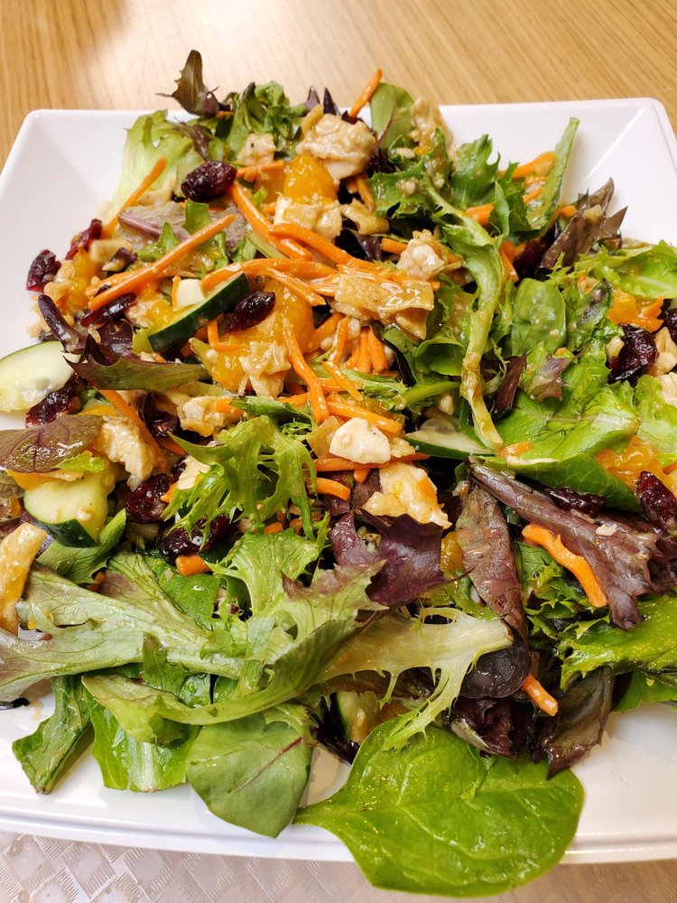 Our Chef recommends a base of our Super Greens Blend. It is served with Sweet Chili Crispy Chicken, Mandarin Oranges, Sliced Cucumbers, Matchstick Carrots, Edamame and Crispy Wonton Strips. We recommend our Sweet Sesame dressing.